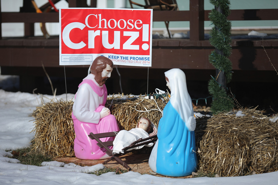 Read moreA poster supporting Republican presidential candidate Ted Cruz sits next to a Nativity scene outside the home of a supporter on January 29, 2016, in Carrol County, Iowa. #
