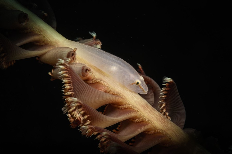 Read moreGoby on a Sea Pen. Commended, Macro. Gobies on sea pens and whip corals are a very common subject for macro photography and I'm always trying to come up with a new way of shooting them. I have had many attempts to get a shot like this with the snooted strobe either mounted on camera or off camera on a tripod but could never get the positioning of the narrow beam just right while trying to manage the camera as well. I was finally able to get the shot I wanted by using our dive guide to position the snoot where I wanted it leaving me free to concentrate on getting the shot. Taken in Anilao, Philippines. #