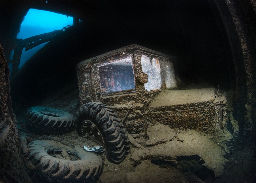 Read moreNeed to change a tire. Highly Commended, Wrecks. The SS Thistlegorm is one big playground for underwater photographers to create good images. In the lower holds that contains several different truck models, you can find this Albion AM468 aircraft fueling truck, one of six trucks. With its characteristic box-shaped cabin, it is a beautiful object to photograph. To get to the natural light, I chose a slow shutter speed to take in as much of the natural background light as possible. I could easily spend the entire dive inside the wreck. Taken in the Red Sea near Egypt. #