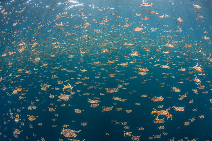 Read moreMillions of crabs. Third Place, International, Behaviour. Every year, millions of crabs (Polybius henslowii) form large red masses in places along the coast of Portugal. This high density of swimming crabs is somewhat rare. On this day we first spotted some dispersed crabs, but it took us almost an hour to find a higher concentration. And a further 20 minutes of blue-water diving until I noticed this immense ‘red cloud’ made up of maybe several thousand crabs swimming through the water. Taken in the Berlengas Natural Reserve, Portugal. #