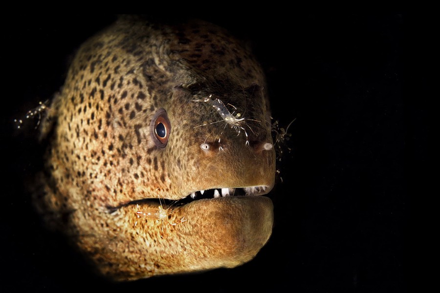 Read moreTransparent Trick. Highly Commended, Up & Coming. We found the Moray on a late afternoon diving trip with my diving buddy, with cleaner shrimps on his head. I spent a lot of time waiting for him to open his mouth wide so I could take a photo of it, but was unsuccessful. Right after I let my photographer buddy use the Moray as a model, he opened his mouth. When my buddy was done taking photos, he let me get back to our model, but by that time, the Moray had his mouth closed again! Taken in the Red Sea, near Egypt. #