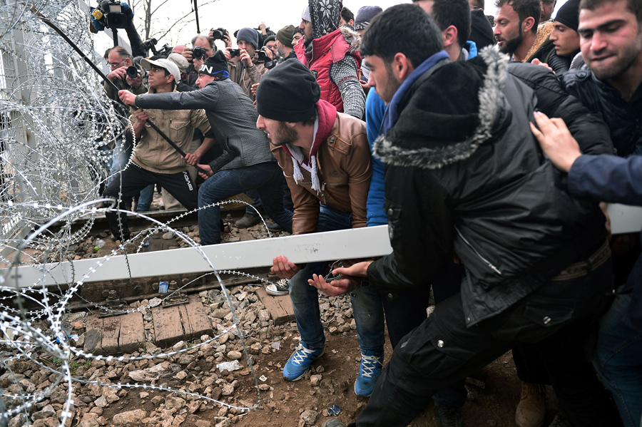 Read moreStranded refugees and migrants try to break a fence on the border as Macedonian policemen use their shields, near the southern Macedonian town of Gevgelija on February 29, 2016. #