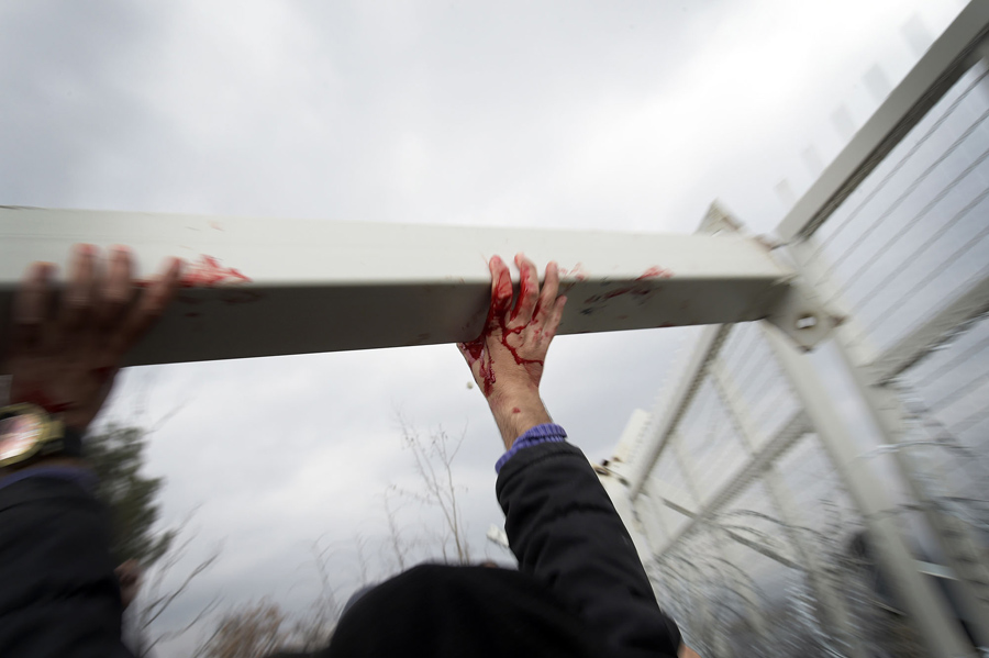 Read moreA man helps a boy who collapsed after inhaling tear gas, after Macedonian police fired tear gas at hundreds of Iraqi and Syrian migrants who tried to break through the Greek border fence in Idomeni, on February 29, 2016. #