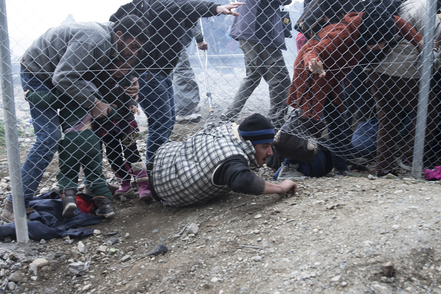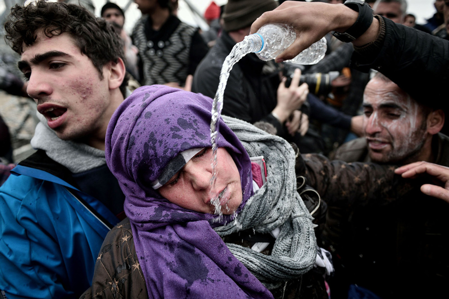 Read moreA refugee pours water on the face of a woman who collapsed after losing her child in a panicked crowd after Macedonian police used tear gas against refugees at the Greek-Macedonian border on February 29, 2016. #