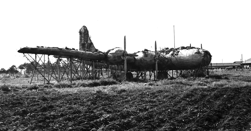Read moreA dummy four-engine bomber aircraft made of wood, with propellers and wheels made from planks and bamboo struts to support the wings. The illusion is enhanced by the use of plants and netting, as if a real aircraft were being camouflaged. This image, and several others below were taken by U.S. military photographers in captured Japanese territory near the end of World War II, circa 1945. From the U.S. National Archives, Records of the United States Strategic Bombing Survey, #