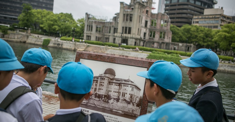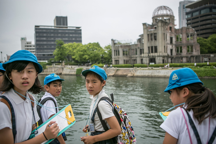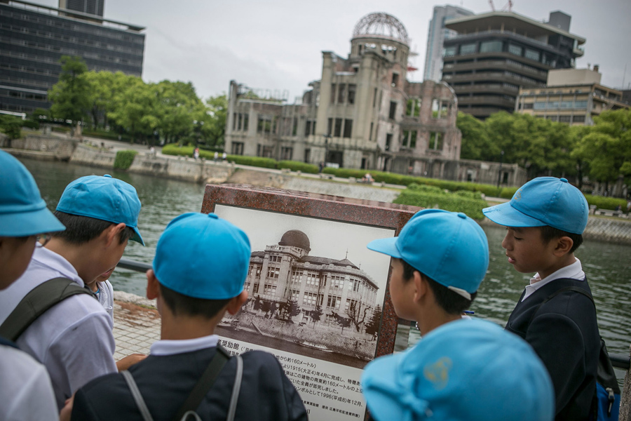 Read moreOn May 26, 2016, schoolchildren look at an old photograph of the Atomic Bomb Dome before the bombing in Hiroshima, Japan, standing across the river from the still-standing ruins. #