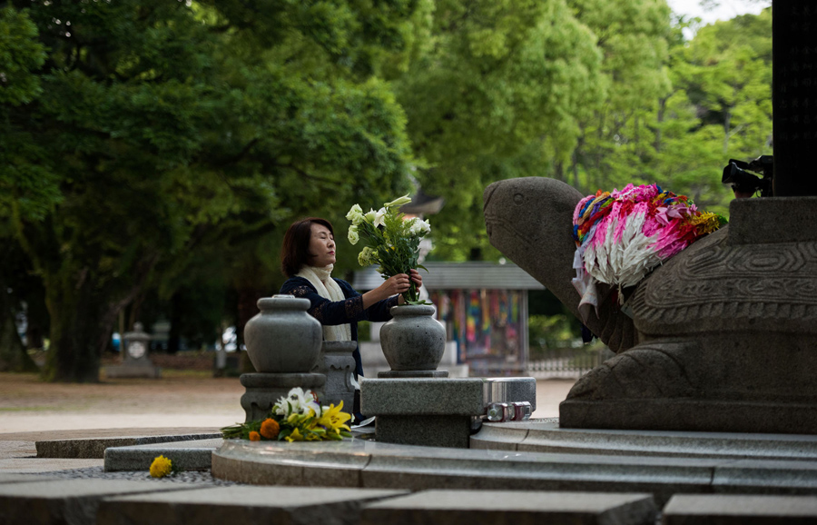 Read moreEmiko Okada, 79, a survivor of the atomic bombing of Hiroshima, poses at the Hiroshima Peace Memorial Park in Hiroshima on May 25, 2016. Okada was about 2.8 kilometers (1.7 miles) from ground zero and suffered severe injuries in the blast in 1945, while her sister died. #