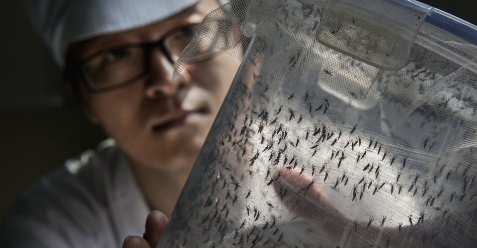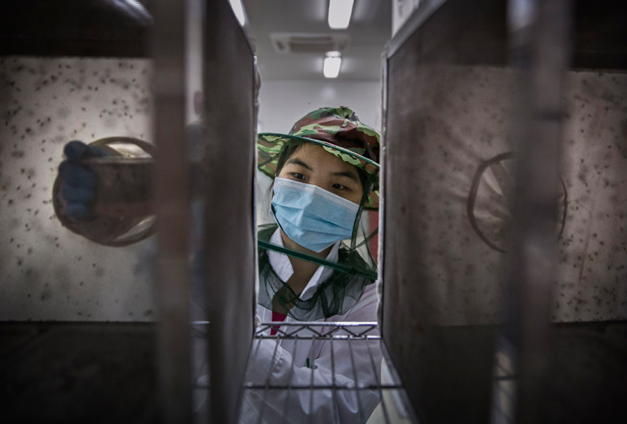 Read moreA lab technician wears a mask as she places mosquito pupa into a cage in a lab in the Mass Production Facility at the Sun Yat-Sen University-Michigan State University Joint Center of Vector Control for Tropical Disease, on June 20, 2016, in Guangzhou, China. #