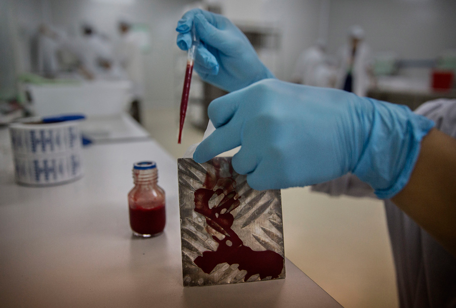 Read moreA lab technician pours animal blood onto a hot plate to feed to mosquitos in the Mass Production Facility in the lab at the Sun Yat-Sen University-Michigan State University Joint Center of Vector Control for Tropical Disease, on June 22, 2016, in Guangzhou, China. #
