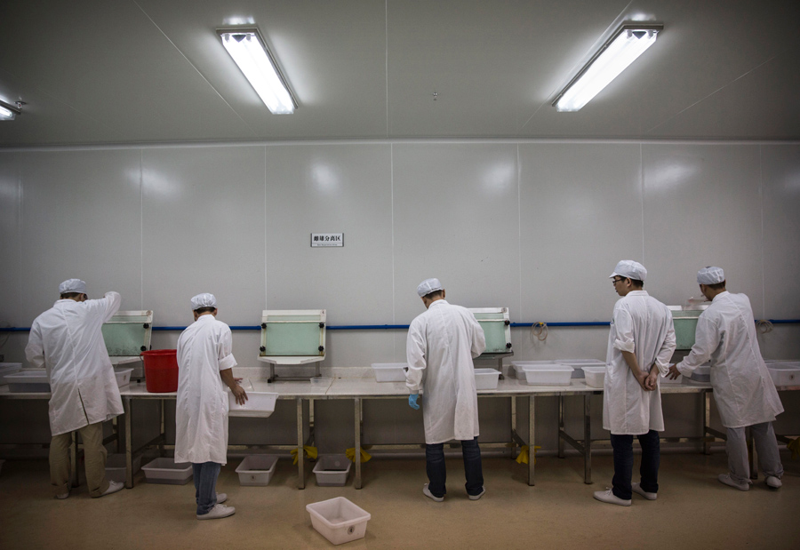 Read moreChinese lab technicians use water to separate male and female larvae in the Mass Production Facility at the Sun Yat-Sen University-Michigan State University Joint Center of Vector Control for Tropical Disease on June 21, 2016, in Guangzhou, China. #
