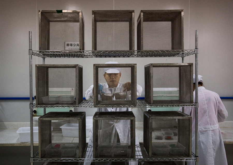Read moreA lab technician places mosquito pupa into cages in the Mass Production Facility at the Sun Yat-Sen University-Michigan State University Joint Center of Vector Control for Tropical Disease, on June 20, 2016, in Guangzhou, China. #