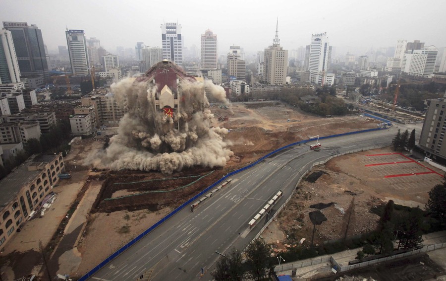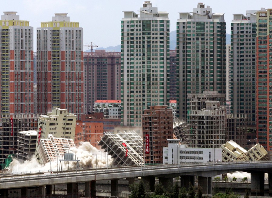 Read moreBuildings topple during demolition with explosives, dubbed "China's number one blast" by Chinese media, at Huanggang district in China's southern city of Shenzhen, near Hong Kong, May 22, 2005. A total 16 private buildings were demolished in the blasts as part of Shenzhen's redevelopment plans. #