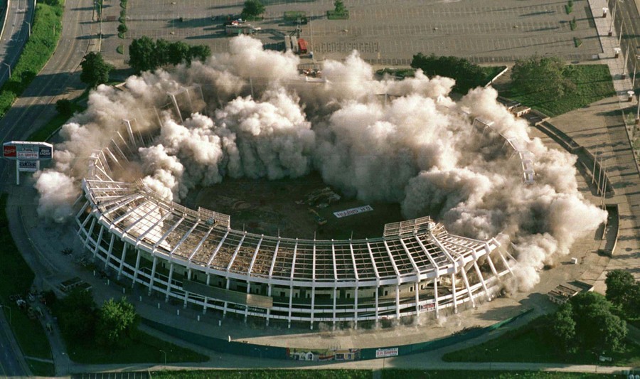 Read moreAtlanta-Fulton County Stadium begins to fall after 350 pounds of explosives detonate in Atlanta, August 2. The stadium was built in 1965, and was the home of the Atlanta Braves and Atlanta Falcons and was used as a Centennial Olympic venue. It was demolished to make room for parking for Turner Field, the new home of the Braves. #