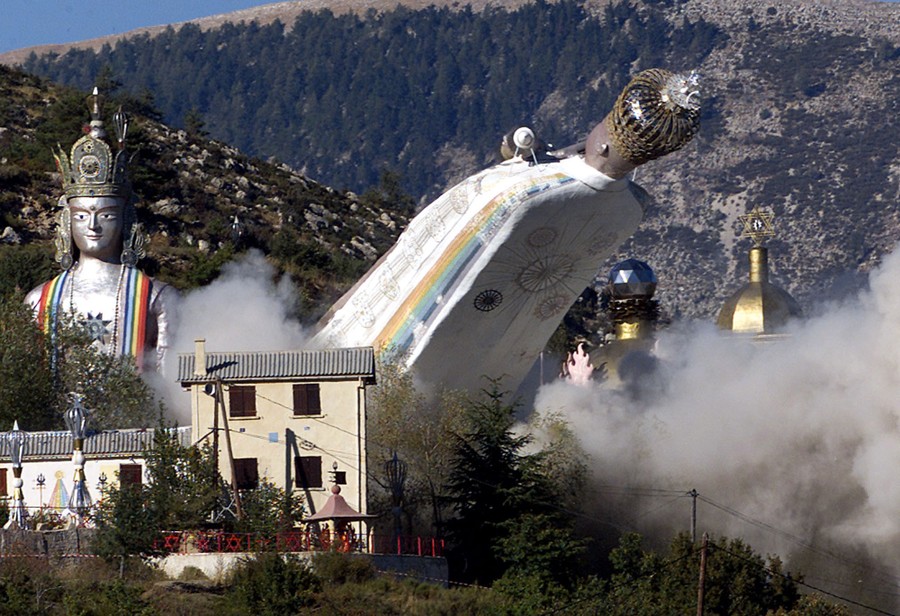 Read moreThe giant statue representing the late Gilbert Bourdin, founder of the Triumphant Vajra cult of Mandarom, collapses after demolition workers set off explosives at the base of the 110-foot structure in Castellane, southern France, September 6, 2001. French authorities said the monument to Bourdin, the focal point of the sect's "holy city of Mandarom" in the hills above Castellane, was built in 1990 without permission. #