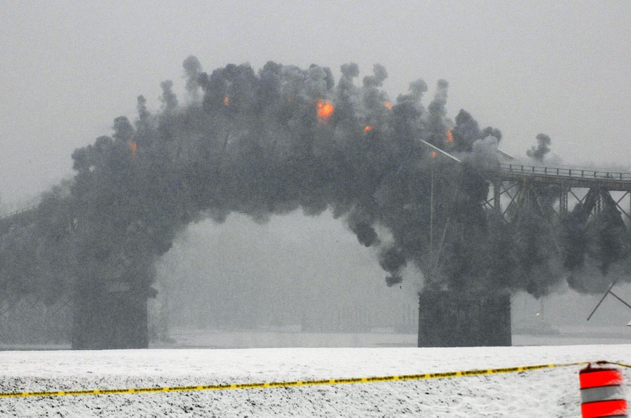 Read moreThe Lake Champlain Bridge is demolished by a controlled explosion during a snowstorm in Crown Point, December 28, 2009. The bridge, which spans the state line between Crown Point, New York and Chimney Point, Vermont, was demolished after engineers determined it was unsafe. #