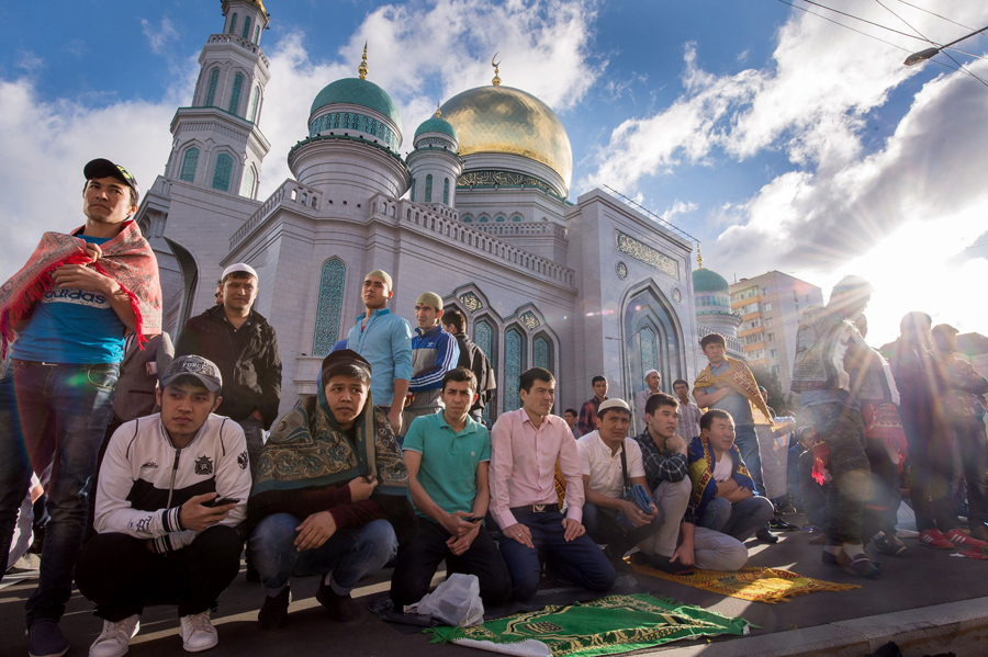 Read moreMuslims gather to offer prayers at the central mosque in Moscow on July 5, 2016, during celebrations for Eid al-Fitr marking the end of the Islamic holy month of Ramadan. #