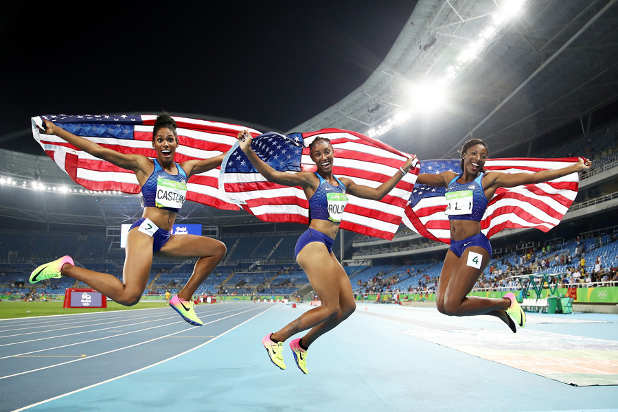 Read moreFrom left, bronze medalist Kristi Castlin, gold medalist Brianna Rollins and silver medalist Nia Ali of the United States celebrate with American flags after the Women's 100m Hurdles Final on Day 12 of Rio 2016. #
