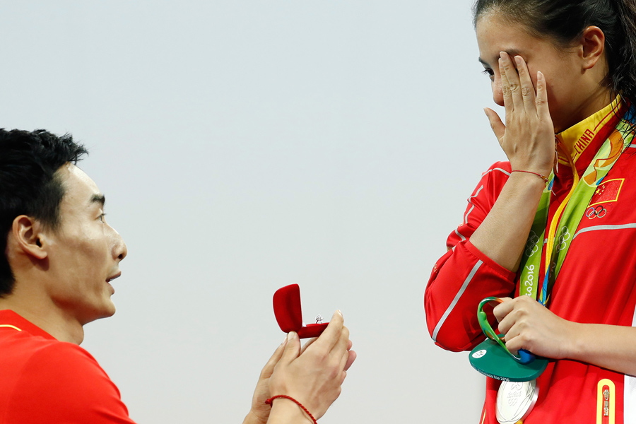 Read moreChinese diver Qin Kai proposes to silver medalist He Zi of China on the podium during the medal ceremony for the Women's Diving 3m Springboard Final on Day 9 of the Rio 2016 Olympic Games. #