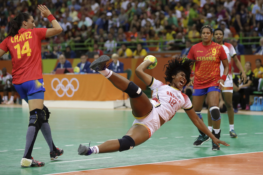 Read moreAngola's Albertina Cruz Kassoma, center, is fouled by Spain's Elizabet Chavez during the women's preliminary handball match between Spain and Angola on August 14, 2016. #