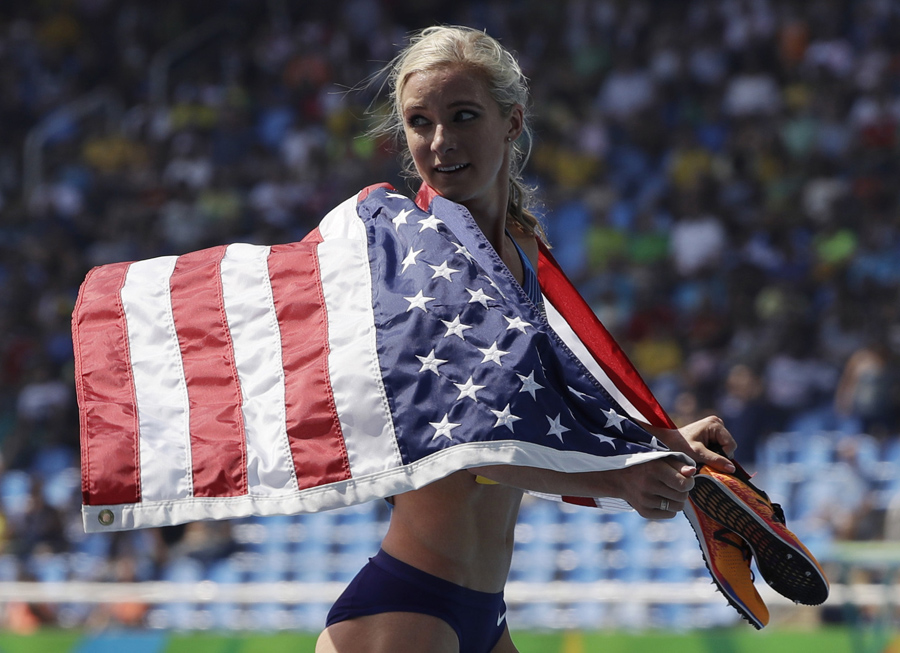 Read moreUnited States' Emma Coburn celebrates with the flag of the United States after winning the bronze medal in the women's 3000-meter steeplechase at the Olympic stadium in Rio on August 15, 2016. #