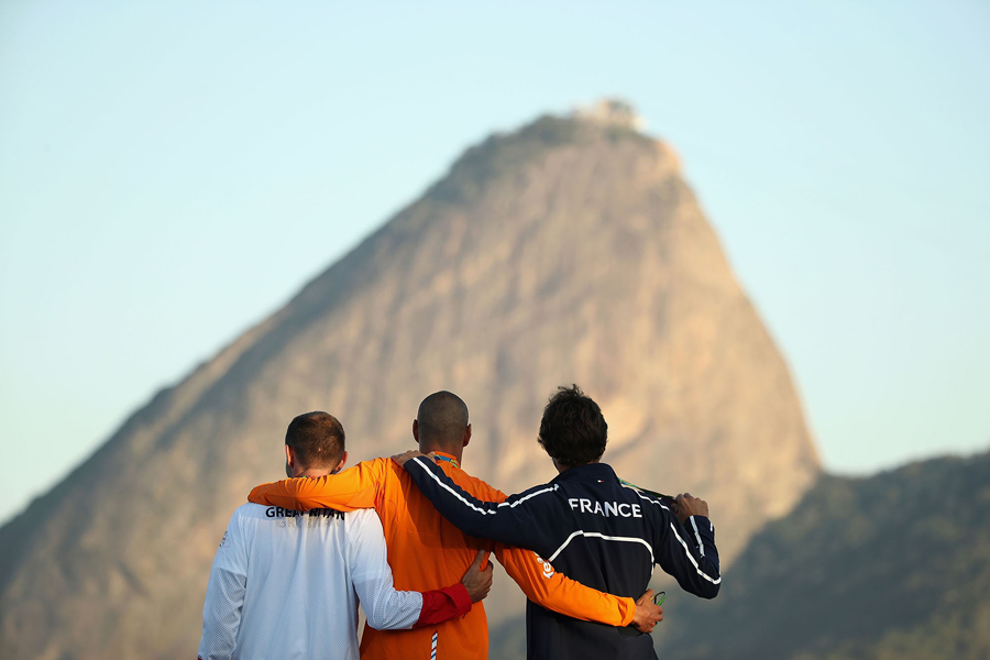 Read moreFrom left, silver medalist Nick Dempsey of Great Britain, gold medalist Dorian van Rijsselberghe of the Netherlands and bronze medalist Pierre le Coq of France celebrate on the podium following the Men's RS:X class windsurfing medal race on Day 9 of Rio 2016. #