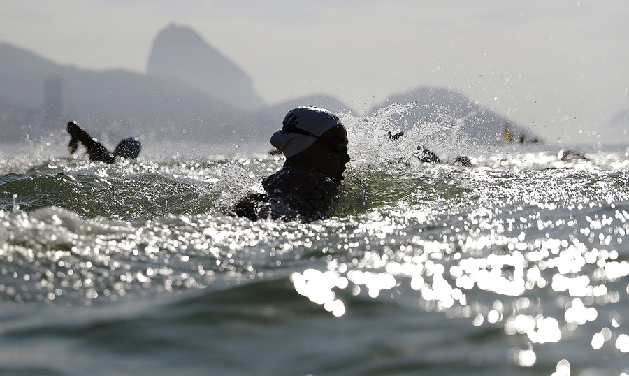 Read moreSharon van Rouwendaal, of the Netherlands, enters the water with fellow competitors as they make their way to the starting line off the shore of Copacabana beach for the women's marathon swimming event in Rio on August 15, 2016. #