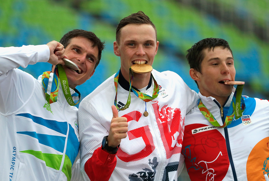 Read moreSilver medalist Peter Kauzer of Slovenia, gold medalist Joseph Clarke of Great Britain and bronze medalist Jiri Prskavec of the Czech Republic celebrate on the podium after the Kayak (K1) Men's Final on Day 5 of the Rio 2016 Olympic Games. #
