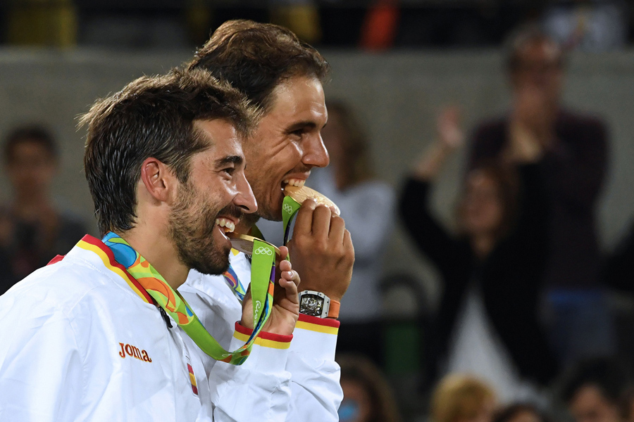 Read moreGold medallists Spain's Rafael Nadal (right) and Spain's Marc Lopez, on the podium of the men's doubles final tennis match at the Olympic Tennis Center on August 12, 2016. #