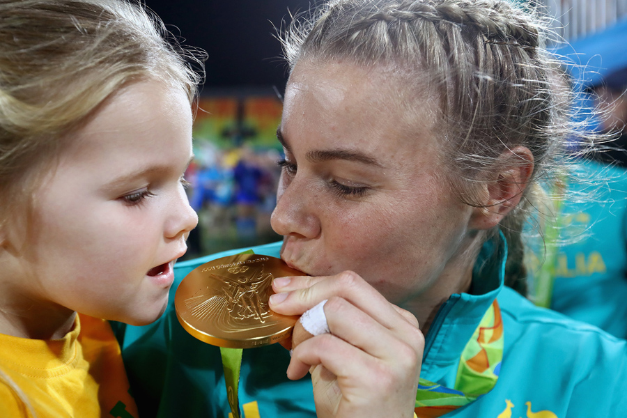 Read moreNicole Beck of Australia shares her Gold medal with her daughter Sophie Beck after the medal ceremony for the Women's Rugby Sevens on Day 3 of the Rio 2016 Olympic Games. #