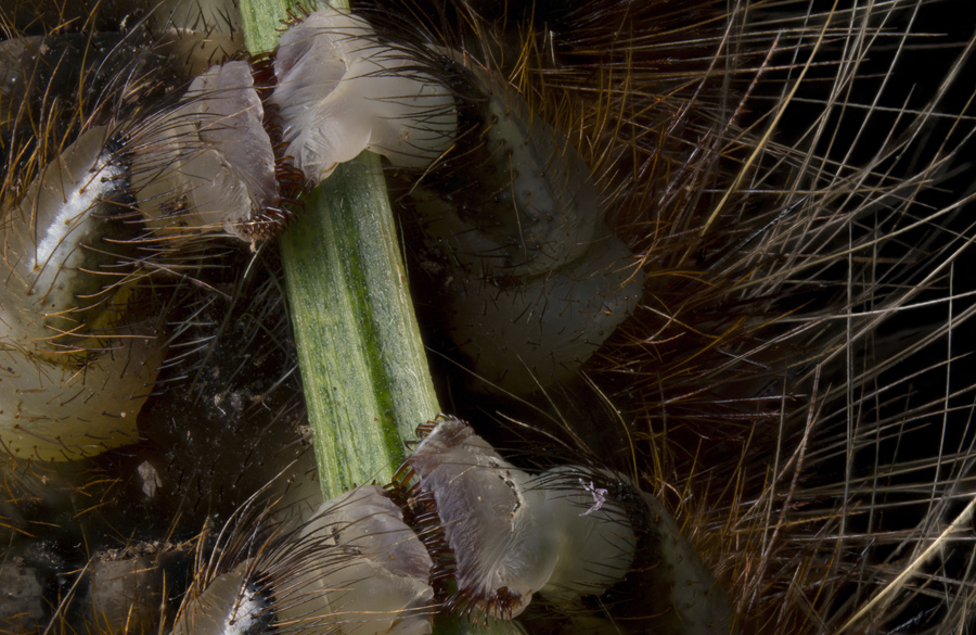 Read moreThe prolegs of a hairy caterpillar gripping a small branch (4x). #
