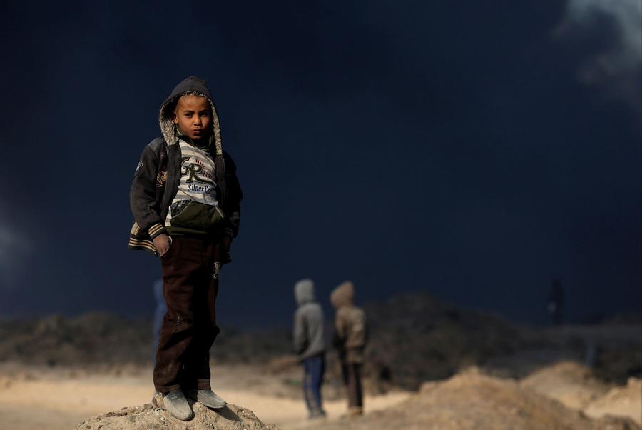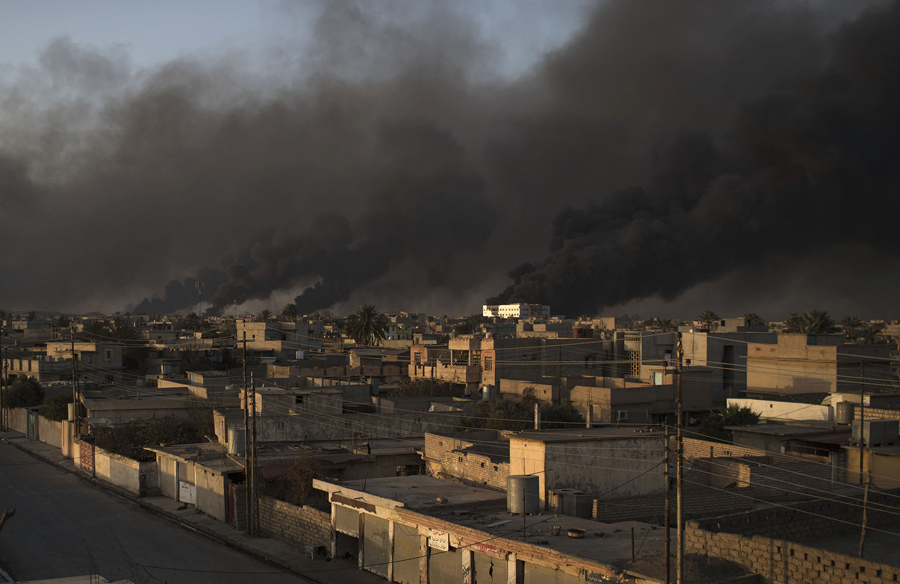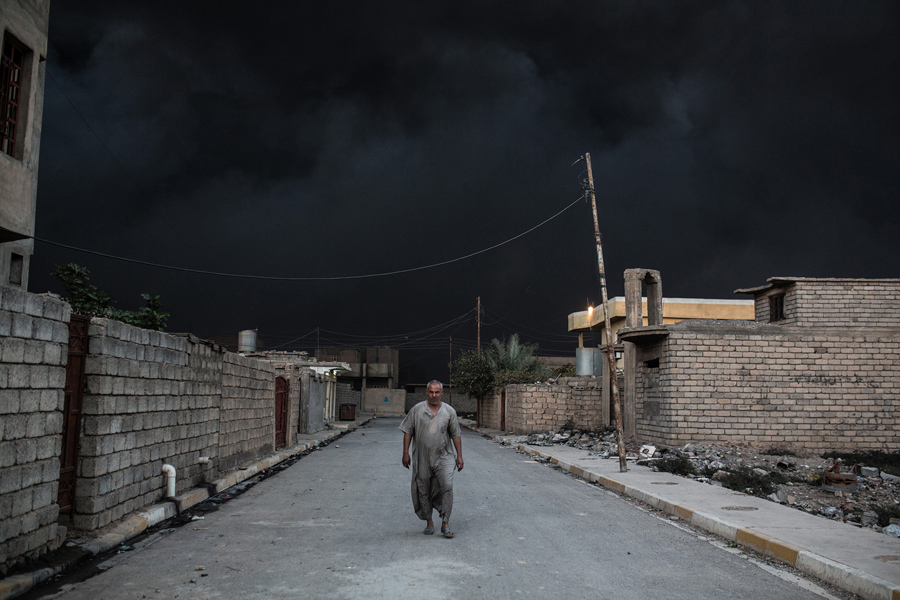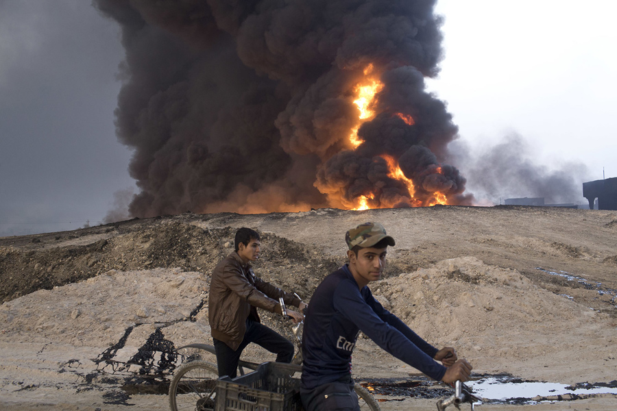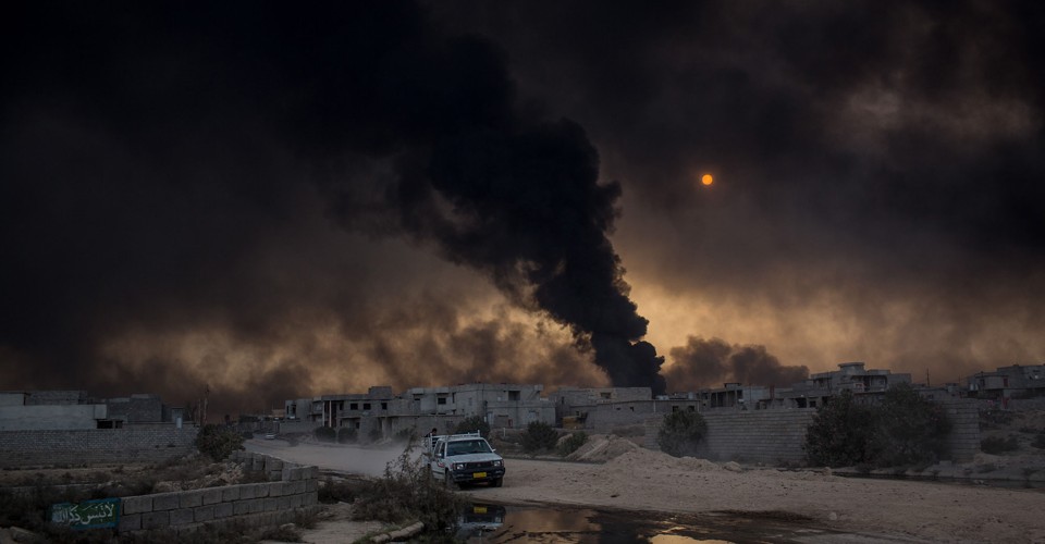 As Iraqi and Kurdish troops close in on the ISIS stronghold of Mosul in Iraq, militants fleeing the region have been sabotaging oil-producing facilities and setting oil wells ablaze, blackening the skies with oily soot for miles. Residents trapped in the area, or attempting to return to their homes, are experiencing health problems related to the smoke, and shepherds are unable to sell the wool of their blackened sheep. As troops are able to stabilize some areas, firefighters attempt to tame the fires before they spread to already-damaged villages nearby.