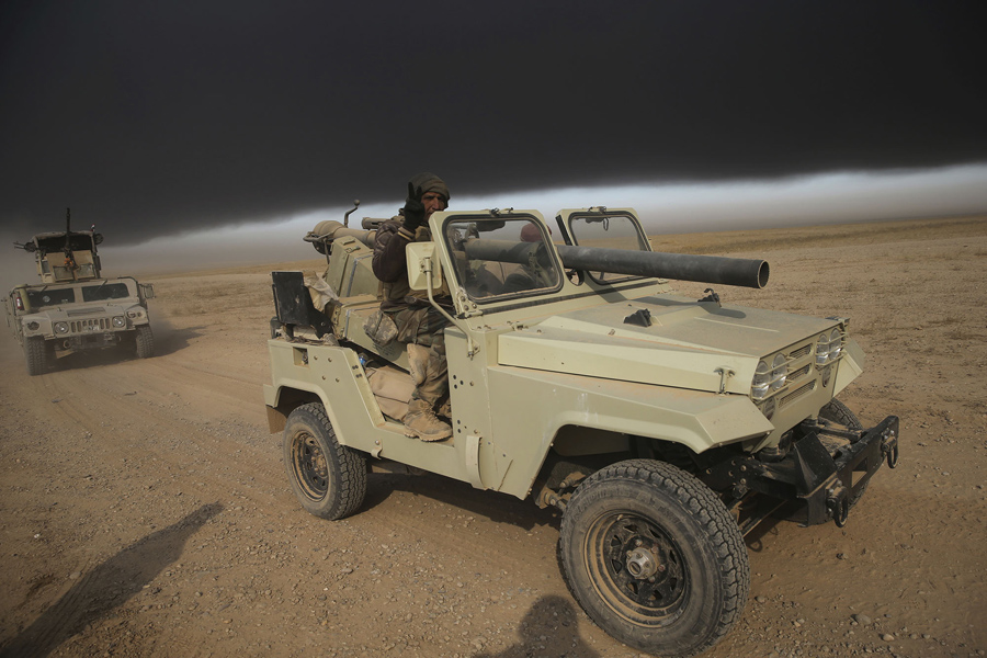 Read moreIraqi army humvees drive on the desert on their way to support their comrade, as black smoke covers the sky during their battle against ISIS, in Haj Ali front line village, southern Mosul, on November 29, 2016. #