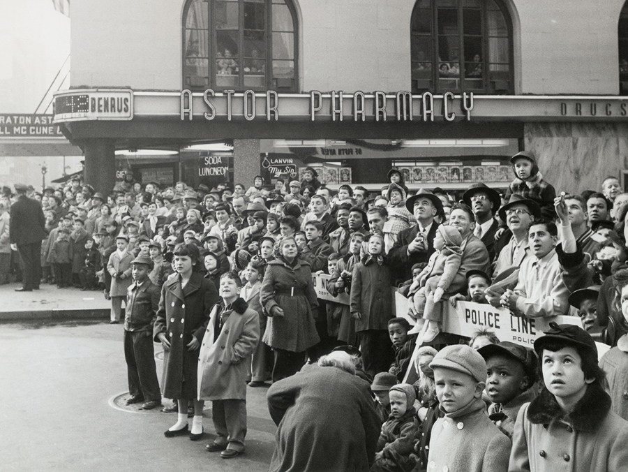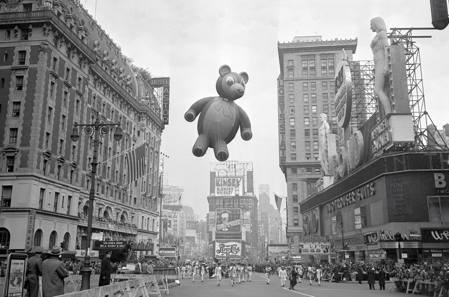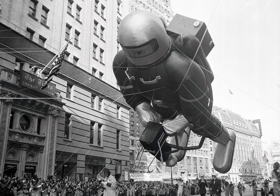 Read moreOriginal caption: Some pretty queer looking pedestrians can be observed at large gatherings at Broadway, but some of the creatures who make their way down the famed thoroughfare in the annual Macy Thanksgiving Parade are enough to faze even a taxi driver. Here throngs of New Yorkers jamming Columbus Circle gape as a flying fish swings onto Broadway from Central Park West. #