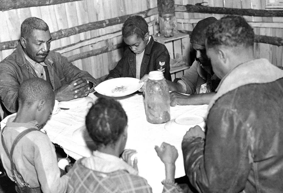 Read moreThis African American sharecropper family of six found nothing in the way of delicacies on their Thanksgiving table on November 23, 1939. They were satisfied with a half-gallon fruit jar of picked tomatoes and here the family is saying grace. They were members of a group near Poplar Bluff, Missouri, a remnant of sharecroppers who engaged in a roadside demonstration in southeast Missouri in January of 1939, protesting their economic status. #
