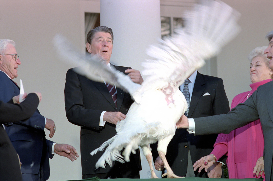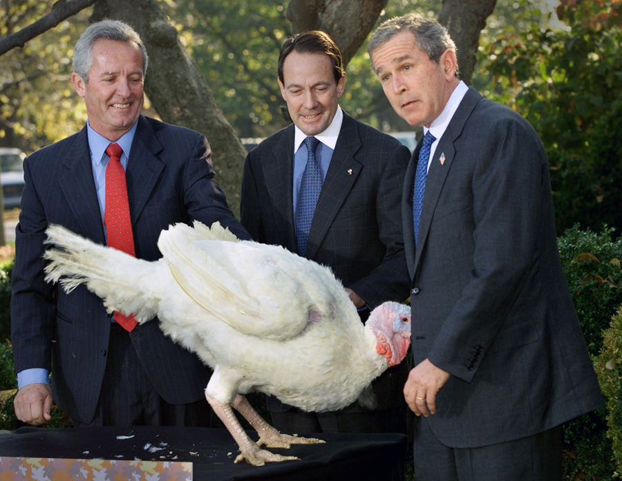Read moreA turkey named "Liberty" surprises President George W. Bush at the annual turkey pardoning event at the White House, three days ahead of Thanksgiving, on November 19, 2001. #