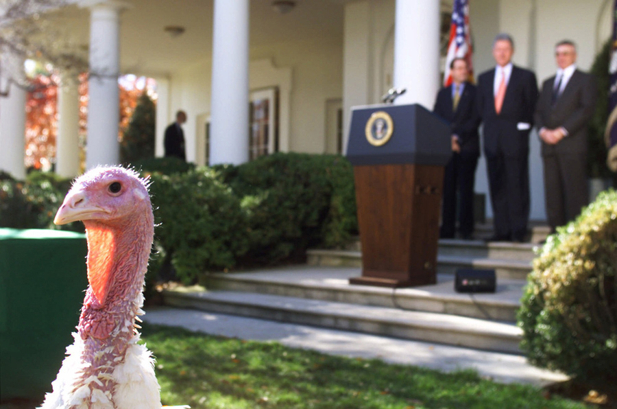 Read morePresident Clinton, flanked by National Turkey Federation (NTF) chairman Frank Gessell, left, and NTF secretary treasurer Jerry Jerome, watch a 45-pound turkey in the Rose Garden of the White House on November 24, 1998, where the president, in a pre-Thanksgiving tradition, pardoned the bird. The bird will be sent to the Frying Pan Park in Fairfax, Virginia. #