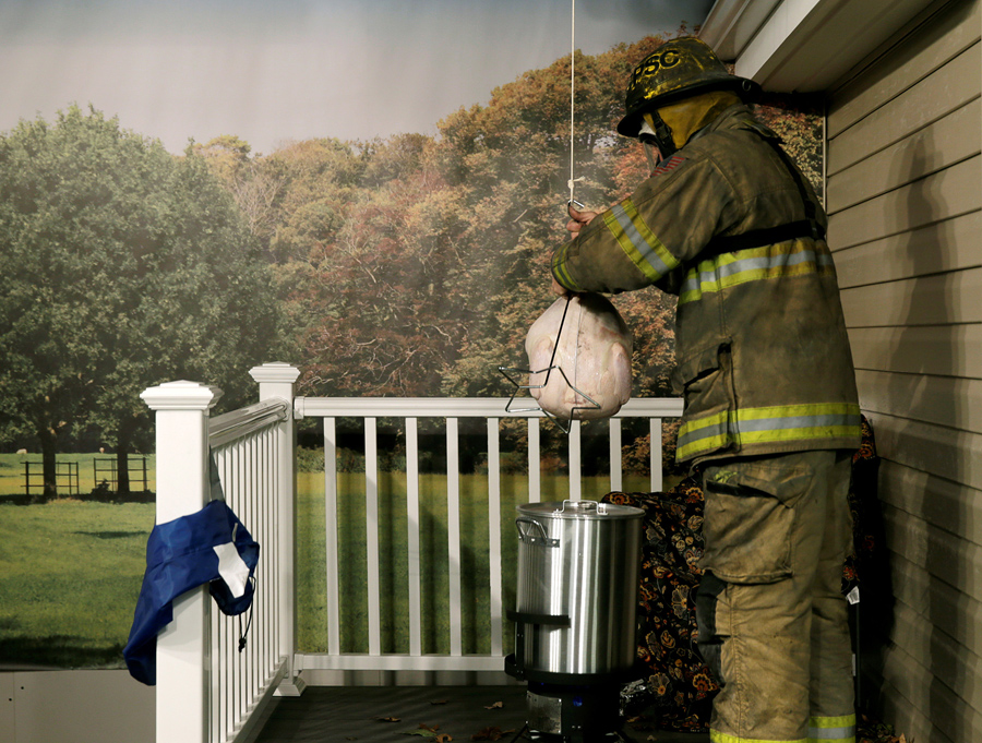 Read more(1 of 3) A firefighter prepares to drop a frozen turkey into a hot deep fryer at a Consumer Product Safety Commission Thanksgiving fire and food safety demonstration of holiday kitchen fires in Rockville, Maryland, on November 22, 2016. #