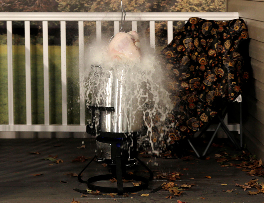 Read more(3 of 3) Flames erupt after a frozen turkey was dropped into a hot deep fryer, spilling oil and catching fire at a Consumer Product Safety Commission Thanksgiving fire and food safety demonstration in Rockville, Maryland, on November 22, 2016. #