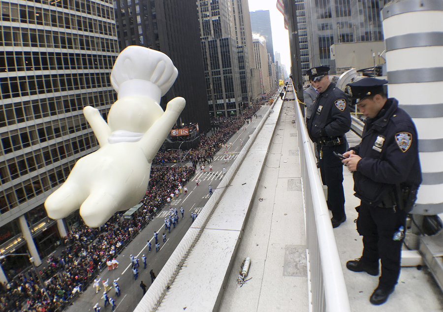 Read moreNew York Police Department officers stand watch from a building as a float proceeds high above spectators along Sixth Avenue during the 89th Macy's Thanksgiving Day Parade in Manhattan on November 26, 2015. #