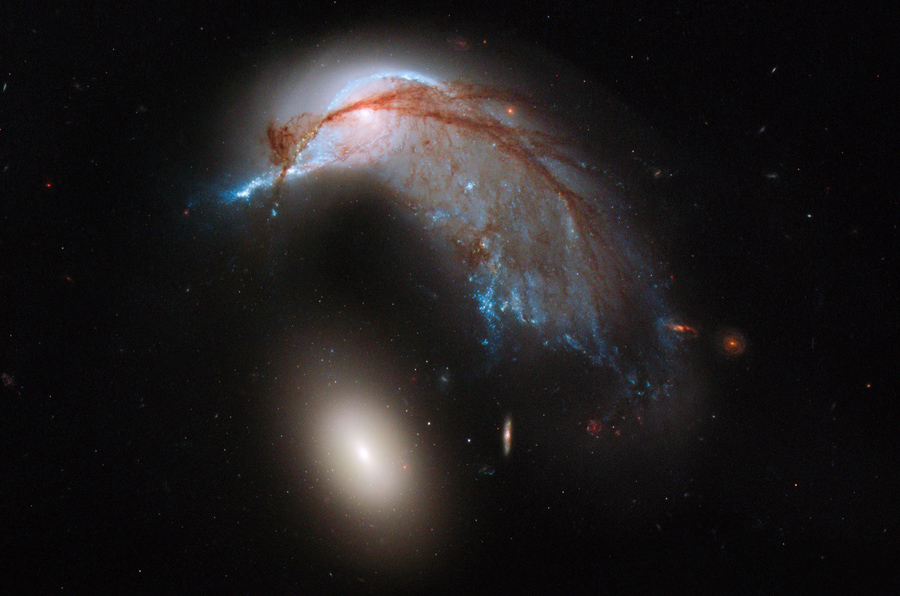 Read moreA Galactic Penguin. From our perspective, viewed by Hubble, this pair of interacting galaxies bears a resemblance to a penguin guarding its egg. NGC 2936, once a standard spiral galaxy, is warped and pulled by neighboring NGC 2937, a smaller elliptical galaxy. The galaxies lie about 400 million light years distant in the Hydra constellation. #