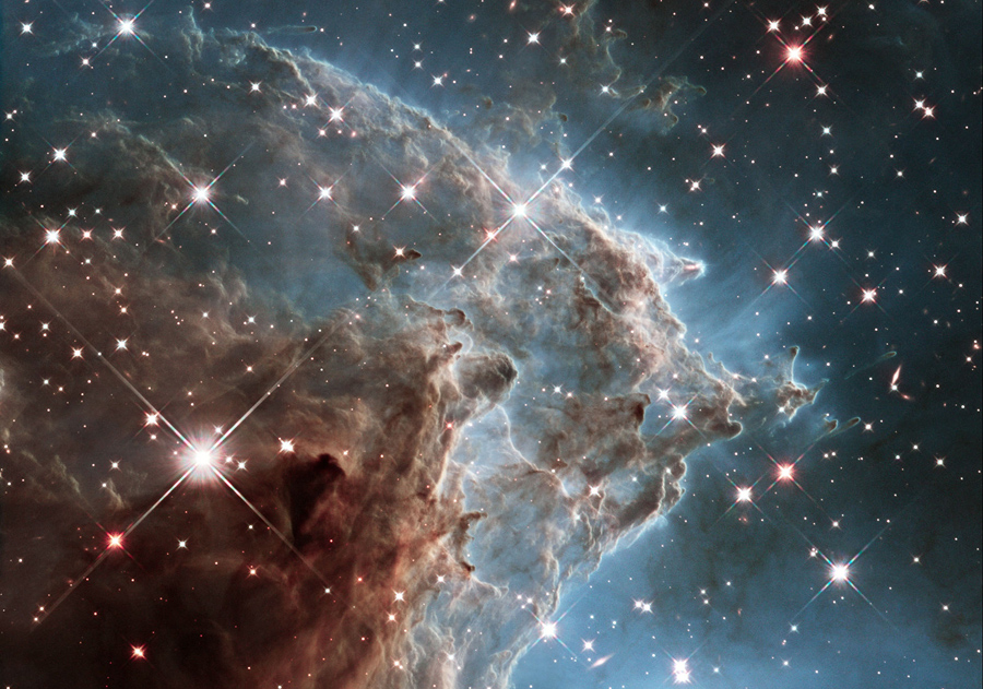 Read moreA stellar nursery in the Carina Nebula. A billowing cloud of cold interstellar gas and dust rising from a tempestuous stellar nursery located 7,500 light-years away in the southern constellation Carina. This pillar of dust and gas serves as an incubator for new stars and is teeming with new star-forming activity. Hot, young stars erode and sculpt the clouds into this fantasy landscape by sending out thick stellar winds and scorching ultraviolet radiation. The low-density regions of the nebula are shredded while the denser parts resist erosion and remain as thick pillars. In the dark, cold interiors of these columns new stars continue to form. #