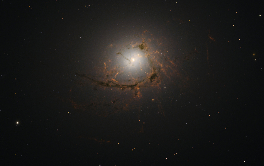 Read moreThis picture, taken by Hubble’s Wide Field Camera 3, shows NGC 4696, the largest galaxy in the Centaurus Cluster. The new images taken with Hubble show the dusty filaments surrounding the center of this huge galaxy in greater detail than ever before. These filaments loop and curl inwards in an intriguing spiral shape, swirling around the supermassive black hole at such a distance that they are dragged into and eventually consumed by the black hole itself. #