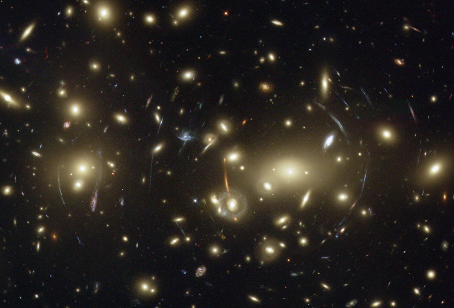 Read moreGravitational Lensing in Abell 2218. This rich galaxy cluster is composed of thousands of individual galaxies. It sits about 2.1 billion light-years from the Earth in the northern constellation of Draco. When used by astronomers as a powerful gravitational lens to magnify distant galaxies, the cluster allows them to peer far into the Universe. However, the strong gravitational forces not only magnify the images of hidden galaxies, but also distort them into long, thin arcs. Multiple distorted images of the same galaxies can be identified by comparing the shape of the galaxies and their color. In addition to the giant arcs, many smaller arclets have been identified. #