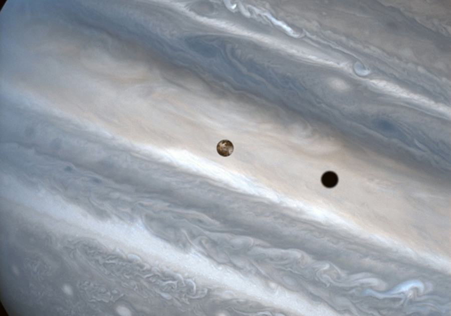 Read moreIo over Jupiter. Jupiter's moon Io, roughly the size of Earth's moon, appears to be skimming Jupiter's cloud tops, but it's actually 310, 000 miles (500,000 kilometers) away. Io zips around Jupiter in 1.8 days, whereas our moon circles Earth every 28 days. The conspicuous black spot on Jupiter is Io's shadow and is about the size of the moon itself (2,262 miles or 3,640 kilometers across). This shadow sails across the face of Jupiter at 38,000 mph (17 kilometers per second). The smallest details visible on Io and Jupiter measure 93 miles (150 kilometers) across, or about the size of Connecticut. #