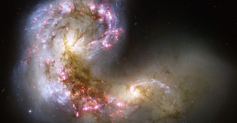 Read moreThe Antennae galaxies, viewed in the sharpest-yet image of this merging pair of galaxies. During the course of their collision, billions of stars will be formed. The two spiral galaxies, about 45 million light-years from our solar system, started to interact a few hundred million years ago, making the Antennae galaxies one of the nearest and youngest examples of a pair of colliding galaxies. Nearly half of the faint objects in the Antennae image are young clusters containing tens of thousands of stars. The orange blobs are the two cores of the original galaxies and consist mainly of old stars criss-crossed by filaments of dust, which appears brown in the image. The two galaxies are dotted with brilliant blue star-forming regions surrounded by glowing hydrogen gas, appearing in the image in pink. #