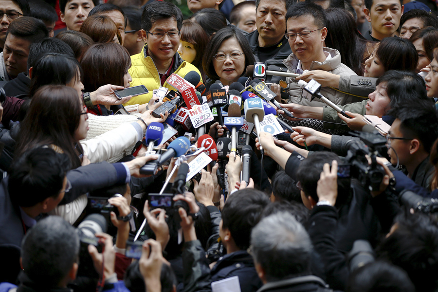 Read moreTaiwan's Democratic Progressive Party (DPP) Chairperson and presidential candidate Tsai Ing-wen addresses reporters after casting her ballot at a polling station during general elections in New Taipei City on January 16, 2016. She later won the election with more than 56% of the vote. #