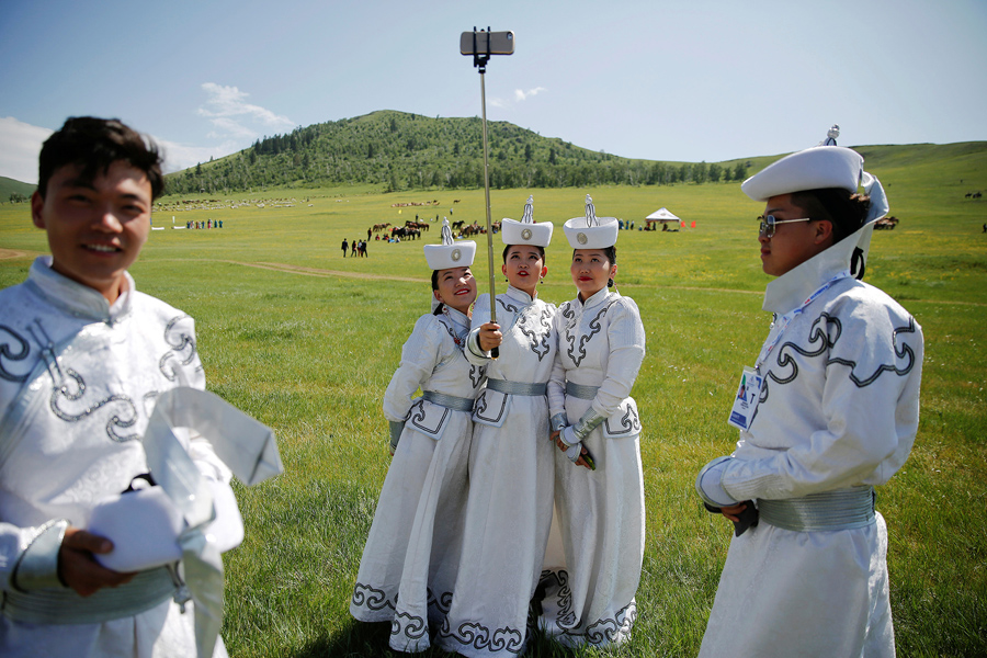 Read morePerformers wearing traditional clothes take pictures of themselves as they wait for delegations to arrive for traditional nomadic Naadam festival performance during the Asia-Europe Meeting summit just outside Ulaanbaatar, Mongolia, on July 15, 2016. #