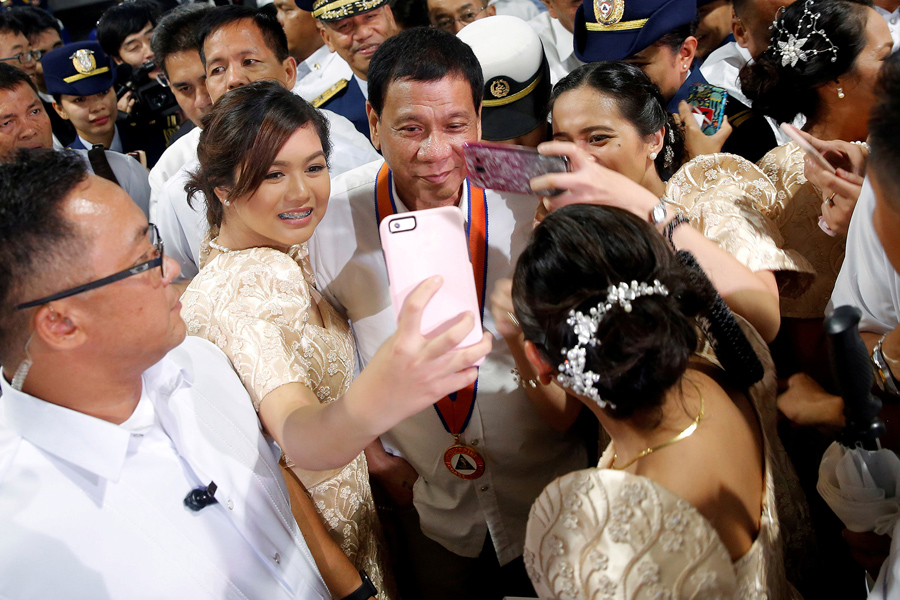Read morePhilippines President Rodrigo Duterte has pictures taken with three girls as they attend the ceremony marking the anniversary of the Philippines Coast Guard in Manila, Philippines, on October 12, 2016. #