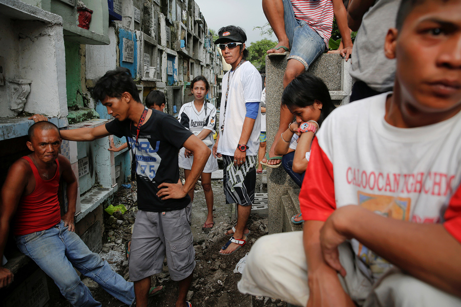 Read moreFriends and relatives of two cousins killed by masked gunmen wait for their coffins to arrive for a funeral at a cemetery in Manila, Philippines, on October 11, 2016. Gilbert Purgatorio and Gerard G. Cruz were killed by masked gunmen near their home on September 27, Gilbert's 27th birthday. #