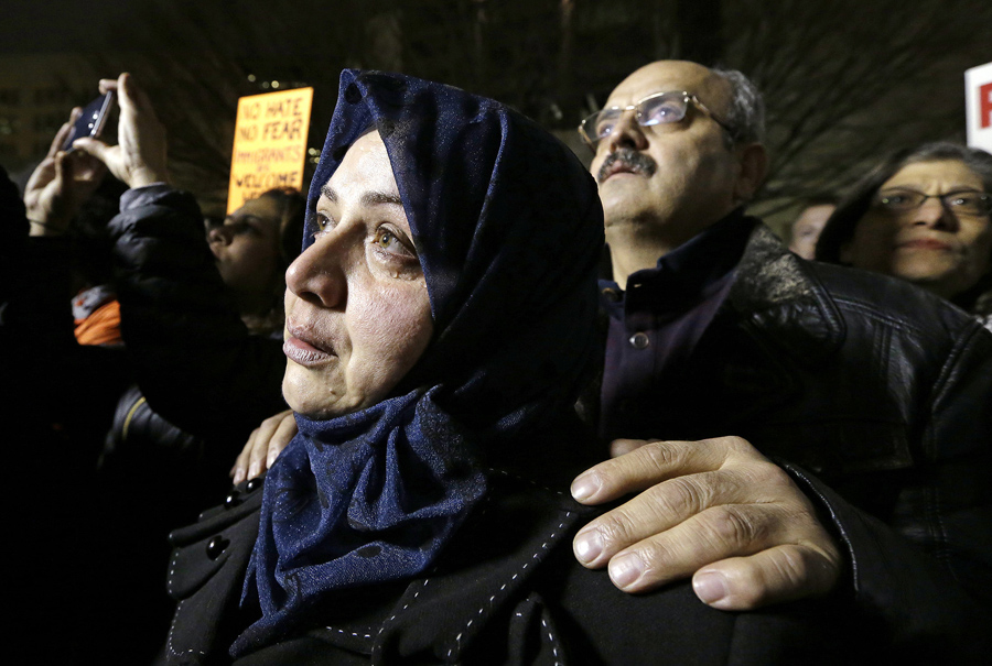 Read moreEmtisal Bazara cries as she and her husband, Ahmad Bazara, both recent Syrian immigrants, look on on January 29, 2017, in downtown Seattle at a rally to oppose President Donald Trump's travel ban. The couple arrived in the Seattle area with two of their four children in December, four years after leaving Aleppo as refugees. The said that their two adult children have been denied entry because of Trump's order. #